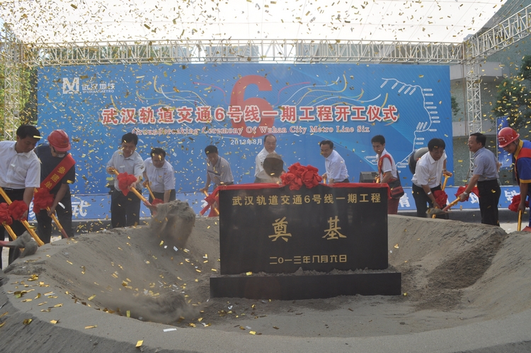 2013年8月6日,銜接漢口、漢陽的重要客運交通走廊、武漢市在建最長的軌道交通線路——軌道交通6號線一期工程隆重舉行開工儀式。圖為市委書記阮成發(fā),市長唐良智,與市民代表、設計、施工、監(jiān)理單位代表一起,為工程開工培土。