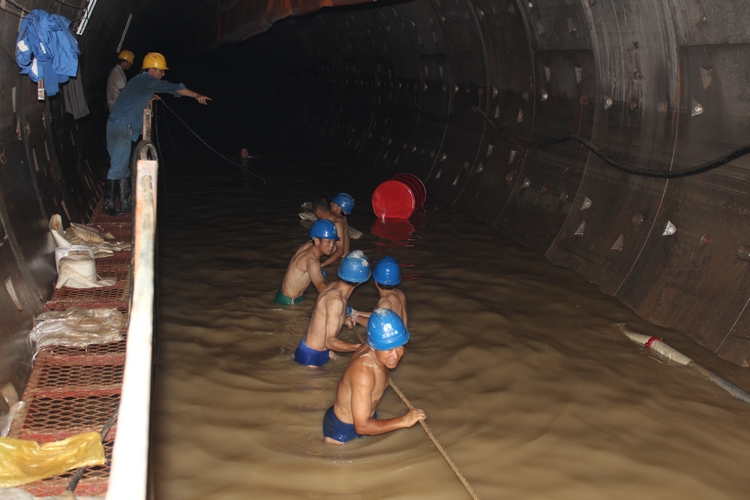 7月7日災(zāi)情發(fā)生后,玉龍路地鐵東段頭井基坑積水數(shù)米深,項目部立即投入排水搶修工作,集團公司董事長胡紅勝親自帶隊搶險,抽調(diào)十余臺大型抽水泵、25噸泵車到施工現(xiàn)場,項目經(jīng)理及現(xiàn)場管理人員一人負責一臺抽水泵的拼裝,綁鐵絲、擰螺絲,自己動手,公司總經(jīng)理王智高、支部書記王繁親自安排抽水泵下井工作,經(jīng)過三十多個工人三天的艱難搶險,終于將隧道中積水排出,一個星期后成功搶救出被淹沒的盾構(gòu)機。之后盾構(gòu)維修人員不畏艱難,跟泥土和水災(zāi)作戰(zhàn),將一個個零件拆下來進行清洗檢修,公司還從海瑞克公司專門聘請兩名專職技術(shù)人員現(xiàn)場指導(dǎo)維修,電氣系統(tǒng)更換配件,重新調(diào)試,液壓系統(tǒng)也送到專業(yè)維修機構(gòu)進行清洗維修,一個多月里解決了一個又一個難題,終于將盾構(gòu)機修好,具備再次始發(fā)的條件。