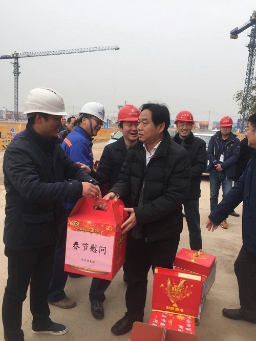 大年三十(1月27日),春節(jié)假期第一天,武漢城投集團公司董事長金國發(fā)、總經理李兵,武漢水務集團王賢兵董事長一行輕車簡從,來到了由武漢水務集團負責代建的夾套河骨干箱涵工程項目建設現(xiàn)場,慰問了節(jié)日期間仍堅守崗位、奮戰(zhàn)一線工程現(xiàn)場抓緊施工的務工人員,并送上新春祝福和節(jié)日慰問。鐘鑫公司副總經理尹艷軍、項目經理付曉陽、彭軼作為工地代表領取了慰問品,也對城投集團領導一行對值守一線的職工進行春節(jié)慰問表示了衷心的謝意。