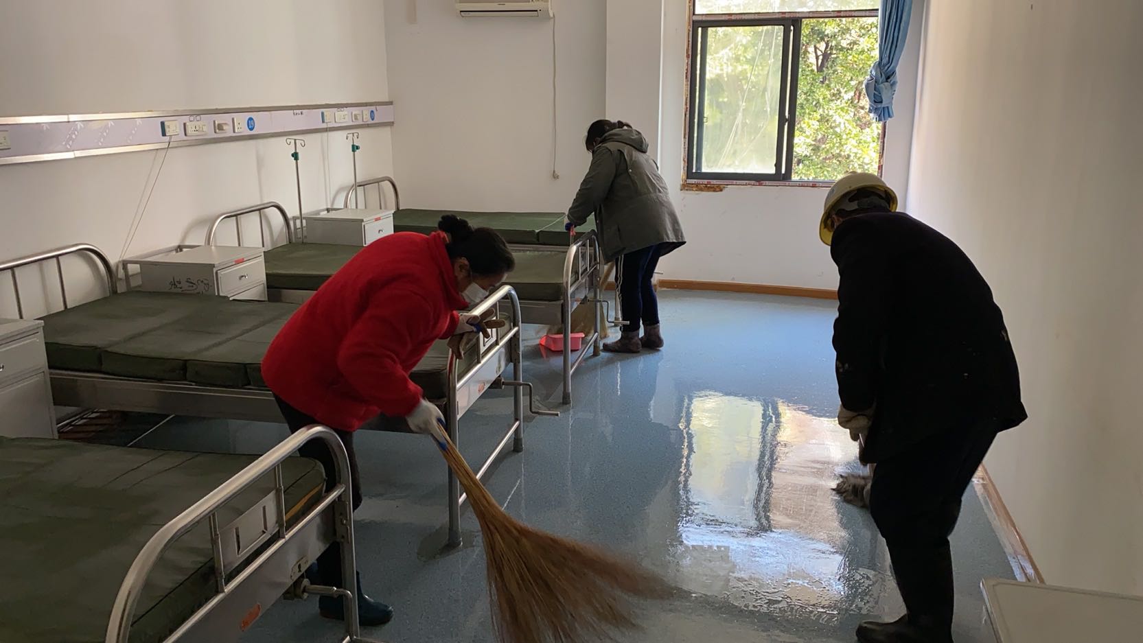 因蓮花湖醫(yī)院閑置已久,現(xiàn)場雜物零亂、灰漬累積,進行全院大清理是搶建的首要工作,經(jīng)過日夜通宵奮戰(zhàn),在250余名勞務(wù)隊員辛勤的勞作下,16日清晨順利完成整個院區(qū)雜物清除、現(xiàn)場清洗等任務(wù);技術(shù)設(shè)計亦是爭分奪秒,技術(shù)人員連夜與設(shè)計單位進行反復(fù)溝通確認,結(jié)合現(xiàn)場實際情況結(jié)合一次又一次地反饋修改,重新規(guī)劃布局醫(yī)院隔離病房設(shè)計,為搶建任務(wù)爭取了寶貴時間;因閑置過久,醫(yī)院已斷水?dāng)嚯?,通水通電成為擺在建設(shè)人員急需解決的最大困難,時不可待,通過重新規(guī)劃水電路線,在管理人員有序的組織下,現(xiàn)場水電工晝夜搶建,目前已基本實現(xiàn)水電全通;隨著隔離板材等物資陸續(xù)到場,后續(xù)隔離病房搭建正緊張有序展開,力爭于16日晚圓滿完成任務(wù)。