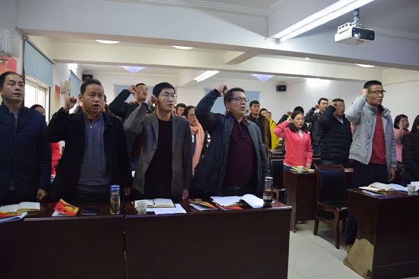 會議伊始,涂書記通報黨員到會和11月份黨費交納情況,全體黨員齊唱國歌。在涂書記帶領下全體黨員重溫了入黨誓詞,一起誦讀黨章第七章《黨的紀律》,聲音鏗鏘有力,高亢嘹亮。