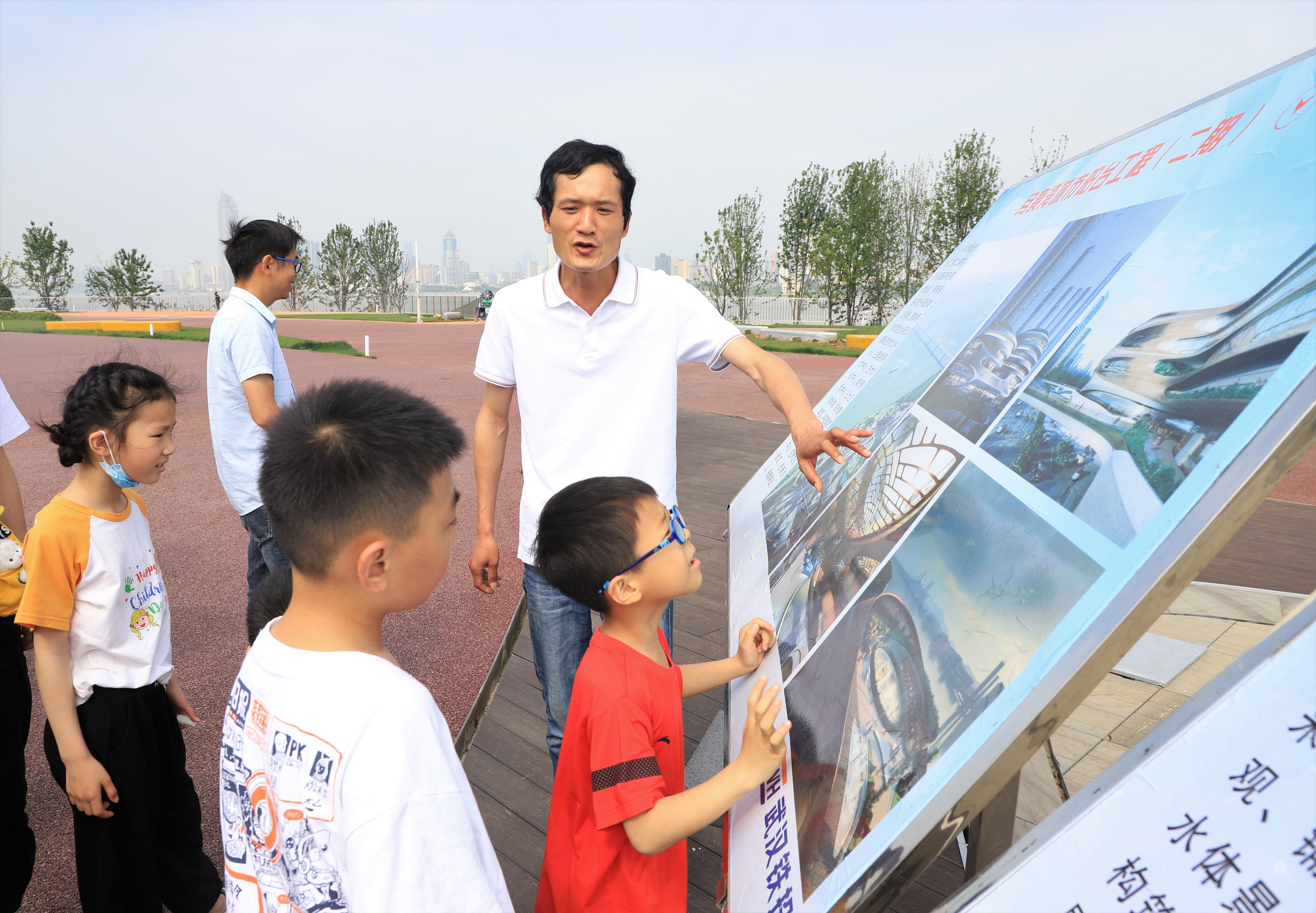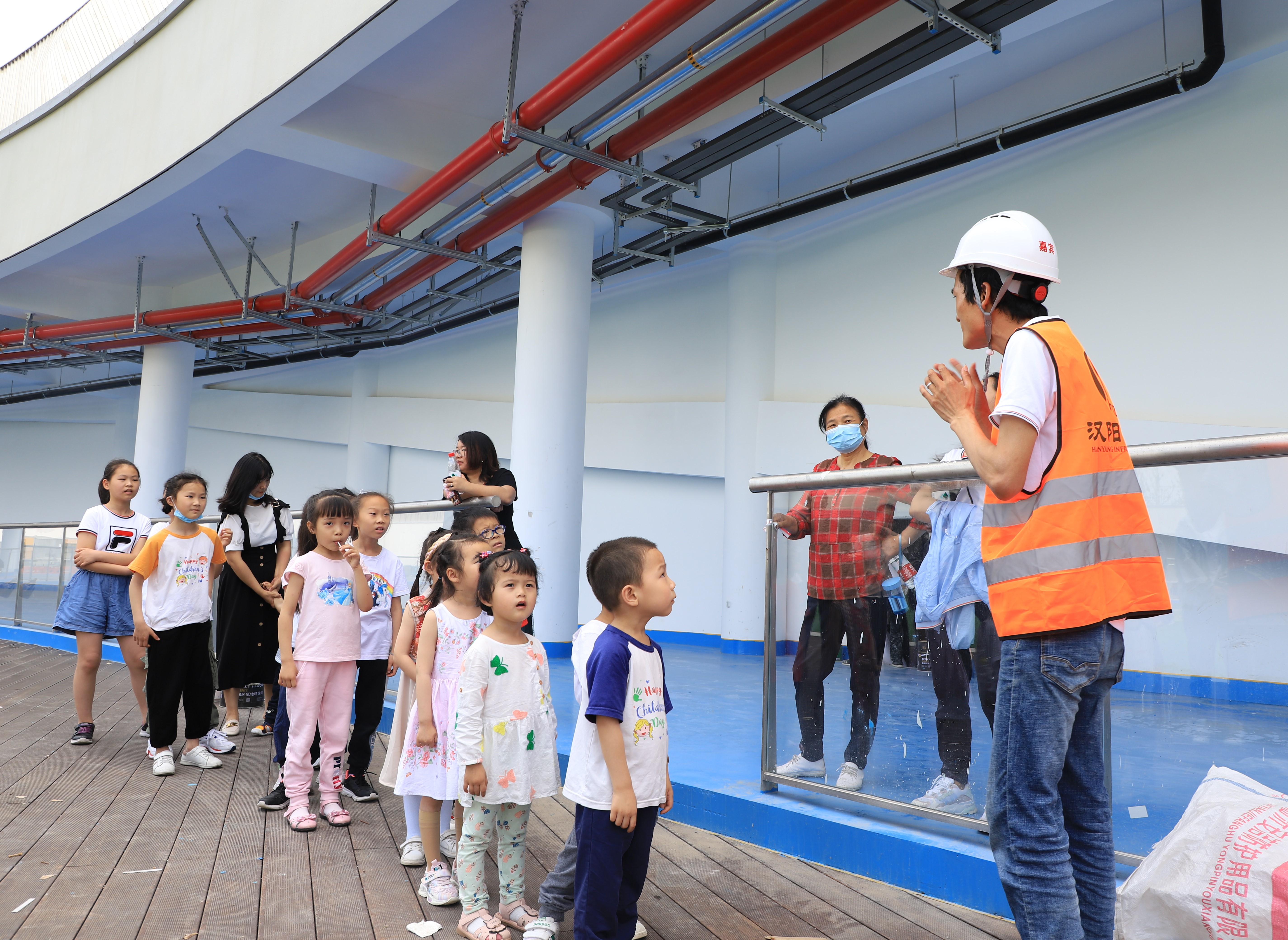 每一座雄宏的建筑,都承載著人們對(duì)美好生活的向往;每一個(gè)精品工程,都是建筑人一磚一瓦堆砌而成;每一位偉大的建筑師,兒時(shí)都曾在心中描繪著未來的樣子?!傲弧被顒?dòng)的第一個(gè)環(huán)節(jié)“父母知多少”,項(xiàng)目安全主管鄭江帶領(lǐng)孩子們參觀月亮灣項(xiàng)目一區(qū)平臺(tái),并講解項(xiàng)目建設(shè)情況,現(xiàn)場(chǎng)施工安全知識(shí)和安全帽、安全背心的正確穿戴方式,讓孩子們身臨其境感受父母的工作環(huán)境、了解父母的工作形象。