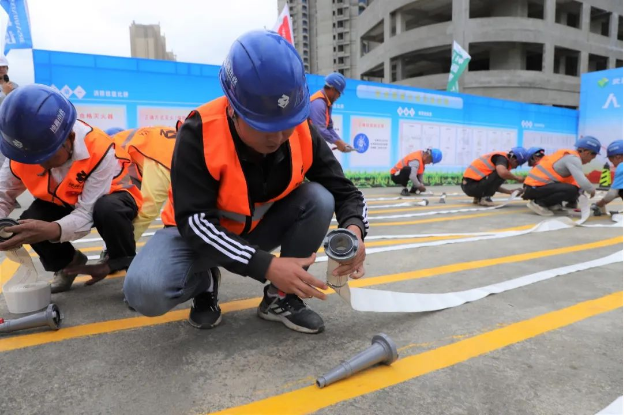 參賽人員組裝2段5m消防水帶及水槍頭。在拼接過(guò)程中,要求水帶連接接頭牢固,未出現(xiàn)打結(jié),通過(guò)規(guī)定動(dòng)作,讓農(nóng)民工熟練掌握用水源滅火的方法。