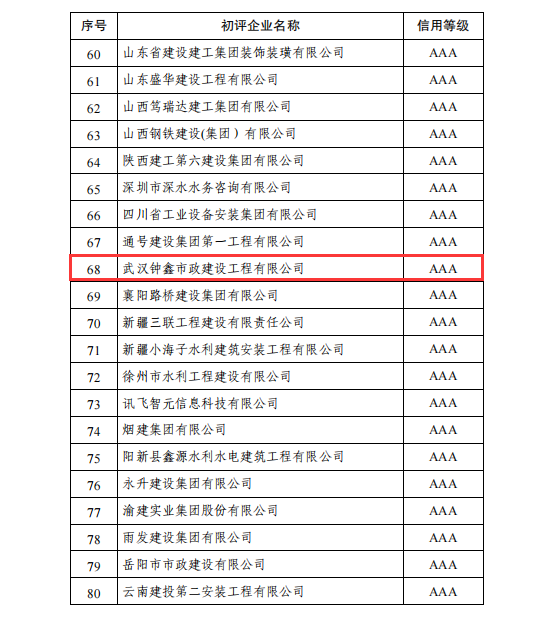 近日,中國施工企業(yè)管理協(xié)會(huì)發(fā)布了《關(guān)于公布2021年度第一批工程建設(shè)企業(yè)信用評(píng)價(jià)結(jié)果的通知》,鐘鑫公司首次獲評(píng)中施企協(xié)AAA信用等級(jí)企業(yè)!被評(píng)定為“經(jīng)營狀況很好,信用記錄優(yōu)秀,發(fā)展前景很廣闊,對履行相關(guān)經(jīng)濟(jì)和社會(huì)責(zé)任能夠提供很強(qiáng)的安全保障,不確定因素對其經(jīng)營和發(fā)展的影響最小”的企業(yè)。